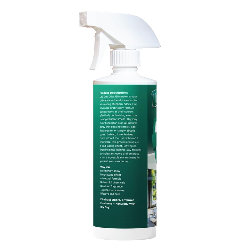 - All-Natural Formula: Made from natural ingredients, Dry Guy contains no harmful chemicals. Easy to Use: Simply spray directly onto the affected area and no need for scrubbing or rinsing. Perfect for shoes, gym bags, lockers, athletic gear, carpets, furniture, car interiors, and more. No Added Fragrance: Leaves behind a fresh, clean environment without any artificial scents.