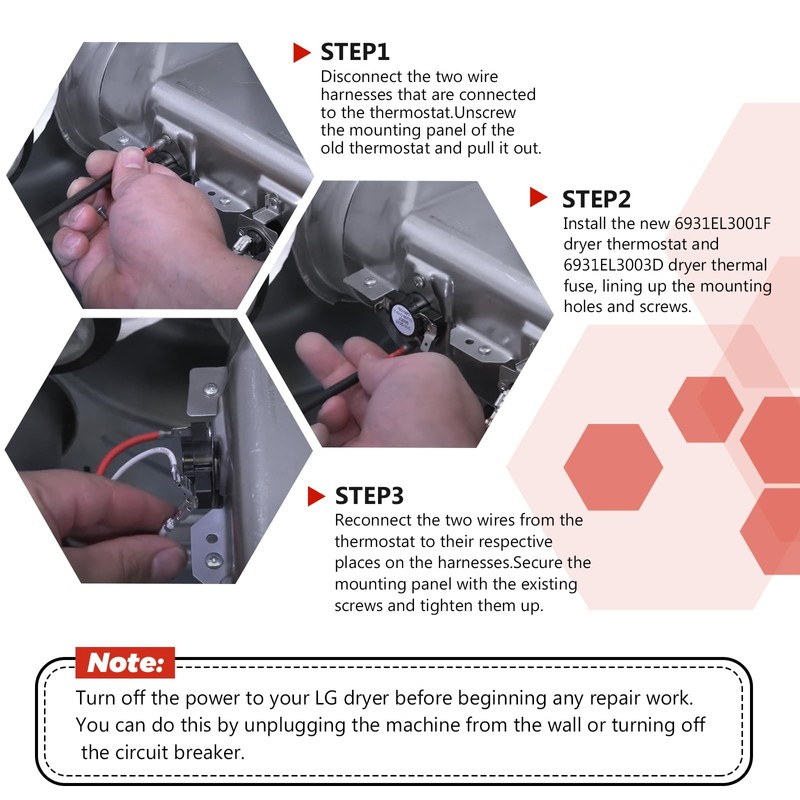 - 【EASY TO INSTALL】Disconnect the power before installing this ap5072172 lg dryer thermal fuse l125-31c part.①Wear work gloves to protect your hands and Disconnect the 2 wire harnesses that are connected to the thermostat.②Unscrew the mounting panel of the old thermostat and pull it out.③Install the new 6931EL3001F dryer thermostat, lining up the mounting holes and screws.④Reconnect the two wires from the thermostat to their respective places on the harnesses.⑤Secure the mounting panel with the existing screws and tighten them up.⑥Turn the power back on and test your new thermostat by running a cycle of the dryer.The 6931el3003d operates the same way