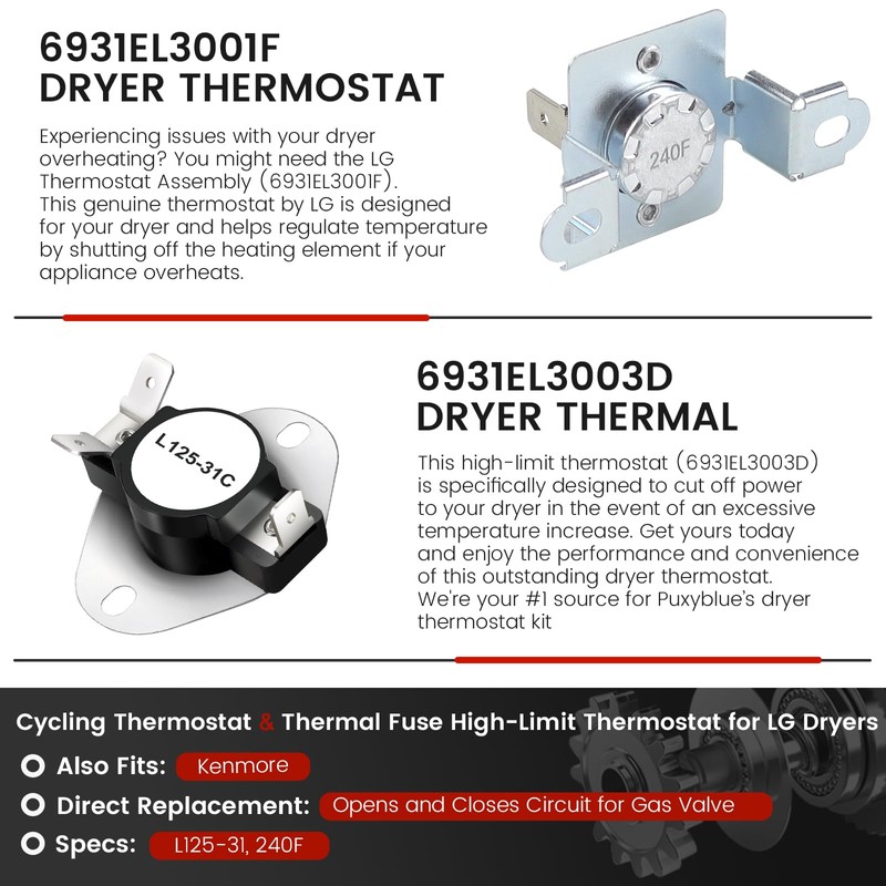 - 【PACKAGE INCLUDES】1 x 6931EL3001F thermostat, 1 x 6931EL3003D thermal fuse thermostat ➤This high-quality thermostat (6931EL3001F) is designed to provide you with years of reliable performance. Its precision temperature control allows you to easily adjust the temperature settings to suit your needs while its durable construction provides the strength and reliability you need to get the job done.➤This high-limit thermostat (6931EL3003D) is specifically designed to cut off power to your dryer in the event of an excessive temperature increase. Get yours today and enjoy the performance and convenience of this outstanding dryer thermostat. We're your #1 source for Puxyblue’s dryer thermostat kit