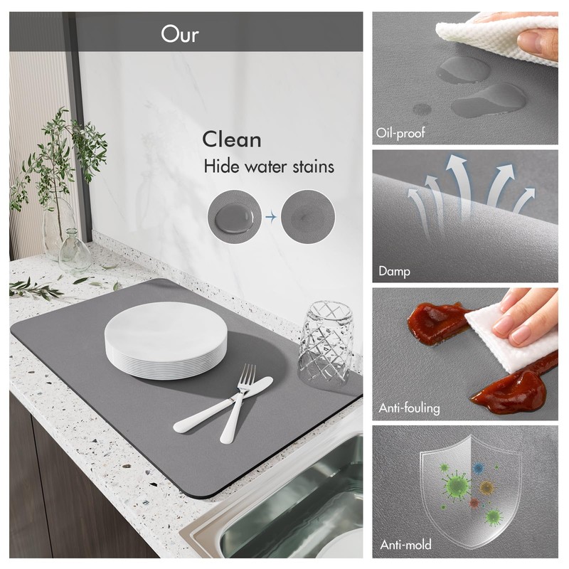 - Dish Drying Mat: Each kitchen counter mat, which is larger than ordinary draining mats and can hold large pots, pans, and more dishes. Dishmats are perfect for under the sink, bathroom countertops.
