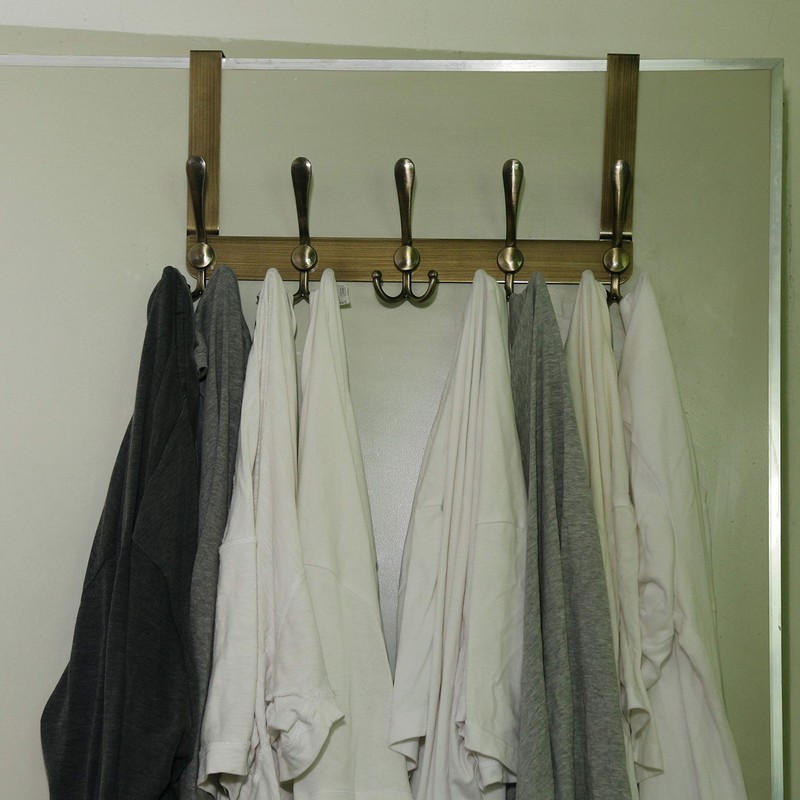 **Dseap Heavy Duty Over the Door Hook with 5 Tri Hooks** Material: Stainless steel Color: bronze **Dimension:** L*W*T=17W * 9.5H * 3.6T inches; **Package Includes:** 1* Dseap Over the Door Hanger **Application Scope:** Perfect behind door hanger hook for hanging clothes, towel, hats, robes, bags and more. The back of door coat hook is ideal to well organize your bathroom, bedroom, mudroom, entryway, closet and more.