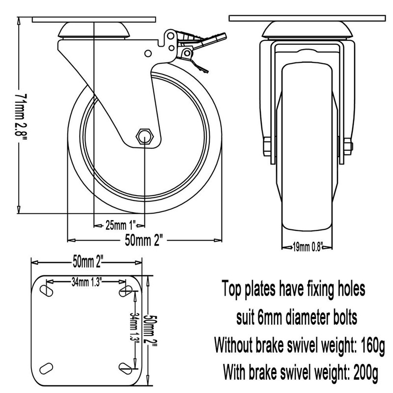 - ⭐Wheels Specification - Wheel Diameter: 50mm 2", Overall Height: 71mm 2.8" Mounting Plate: 50mm x 50mm 2" x 2" Free 16PCs 6mm x 27mm Screw fitting