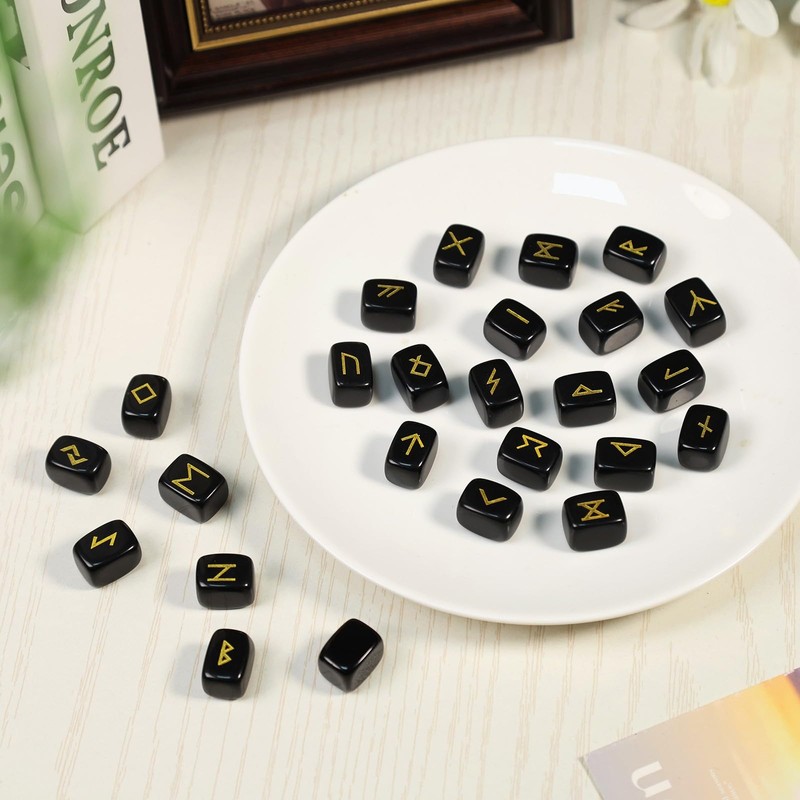dssmboom Pack of 25 Rune Stones Engraved Pagan Lettering, Irregular Tumbled Stone Set with Golden Elder Futhark Alphabet for Crystal Divination Wicca and Reiki Healing, Black Obsidian