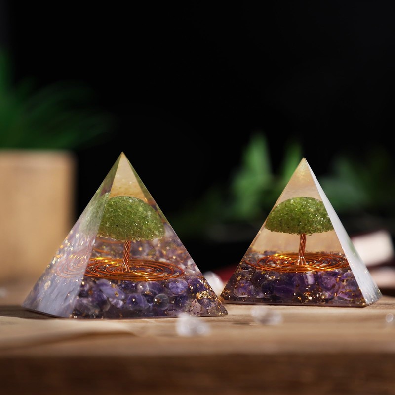 - Handmade Pyramid We crafted the crystal pyramid that combines resin, crystal stone chips, copper wires and shimmering copper powder. The inner structure of this stone pyramid has been cleverly designed with a tree of life of peridot energy crystals standing in the center. The root system of this stone tree is covered with spiral coils and copper powder, adding a touch of visual shine.