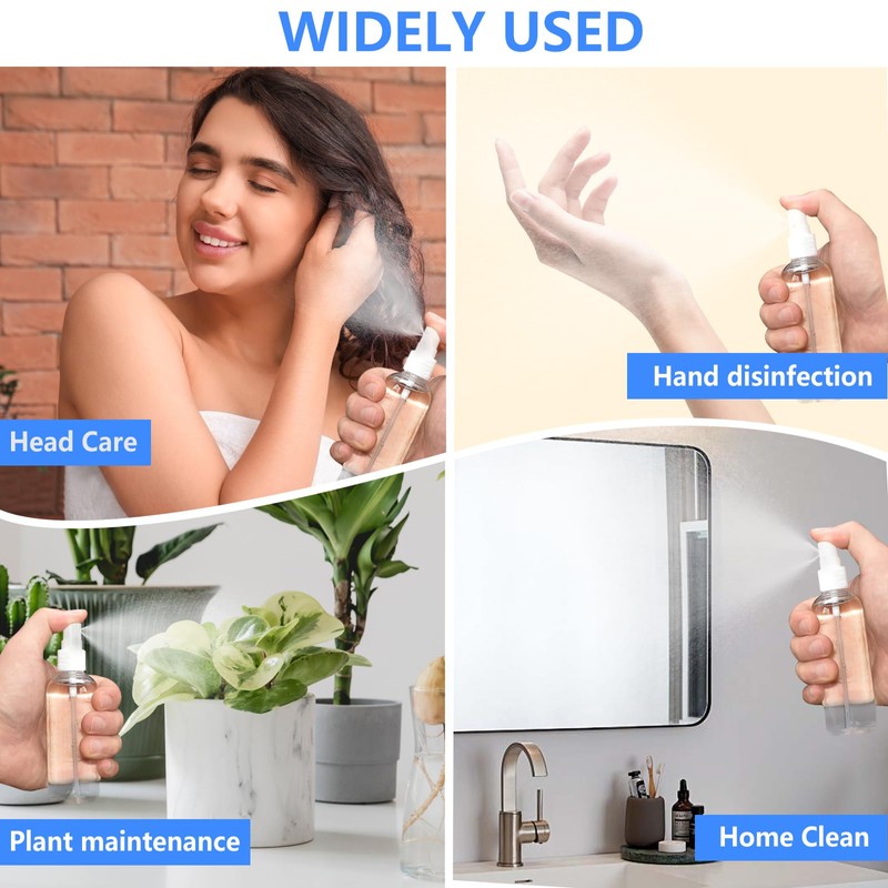 - Durably DesignedFeaturing a threaded bottle mouth design for easy opening and a secure double-layer seal, these clear spray bottles are perfect for on-the-go use. The transparent sealing cap and spiral bottle mouth ensure a tight seal, preventing leaks even when turned upside down. Additionally, the full dustproof cover protects the nozzle from dust and maintains hygiene, while also preventing any liquid leakage.
