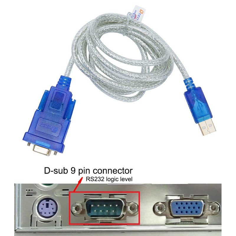 - 6ft USB to serial cable with standard USB Type A Male to standard 9-pin DB9 Female RS-232 serial connector