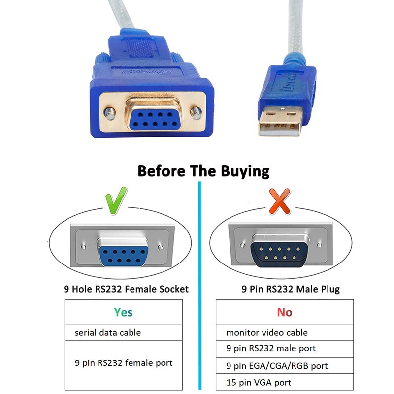 - Note that the interface is 9-pin RS232 Female socket, please make sure that your serial device with a 9-pin Male Port before purchasing this USB to serial port adapter with Prolific PL2303 chipset (NOT FTDI chip)