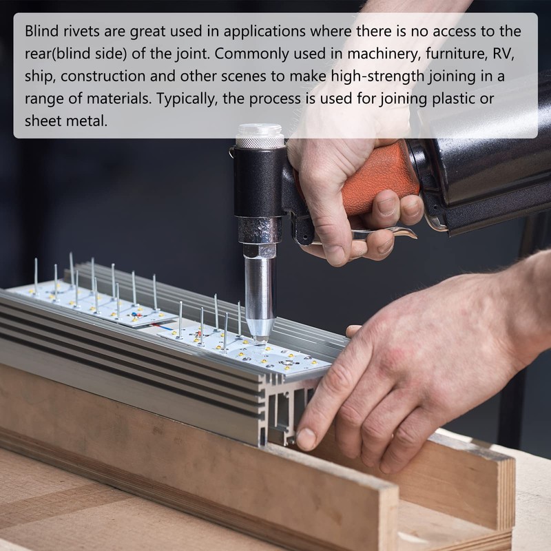 • [GREAT CHOICE]: Blind rivets are very useful for applications that do not get into the back of the fitting (blind side). It is commonly used in a series of materials that create high-strength connections in machinery, furniture, RVs, marine, architecture, etc. Typically, this process is used to connect plastic or metal plates