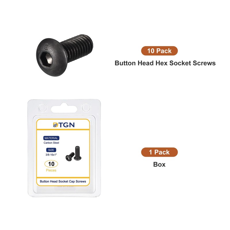 - [Internal Hex Socket Screw]: Package contains 10 pcs Thread Diameter: 0.375 inch, Number of Teeth: 16 Thread Length: 1 inch, Head Diameter: 0.656 inch, Head Thickness: 0.199 inch Full Thread UNC Button Head Socket Screws