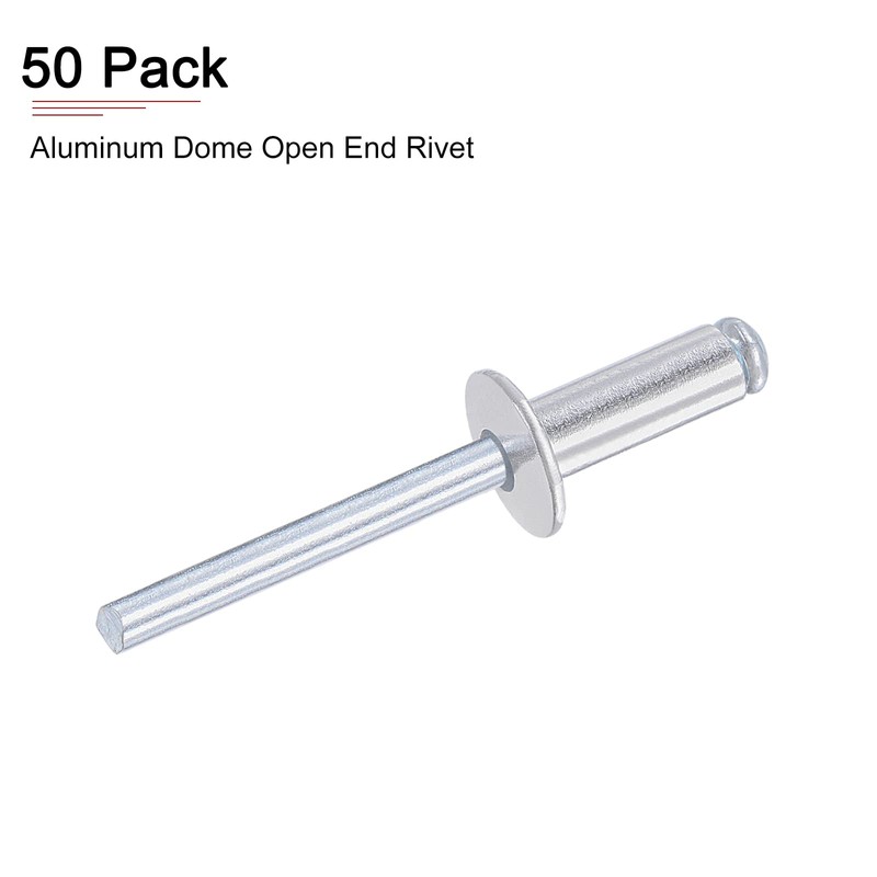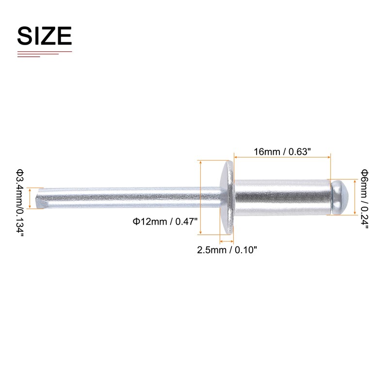 - [Blind Rivets]: The package comes with 50pcs of silver tone open end blind rivets in 6mm/0.24" rivet dia., 16mm/0.63" grip length, 12mm x 2.5mm/0.47" x 0.10"(Dia*T) flange size.