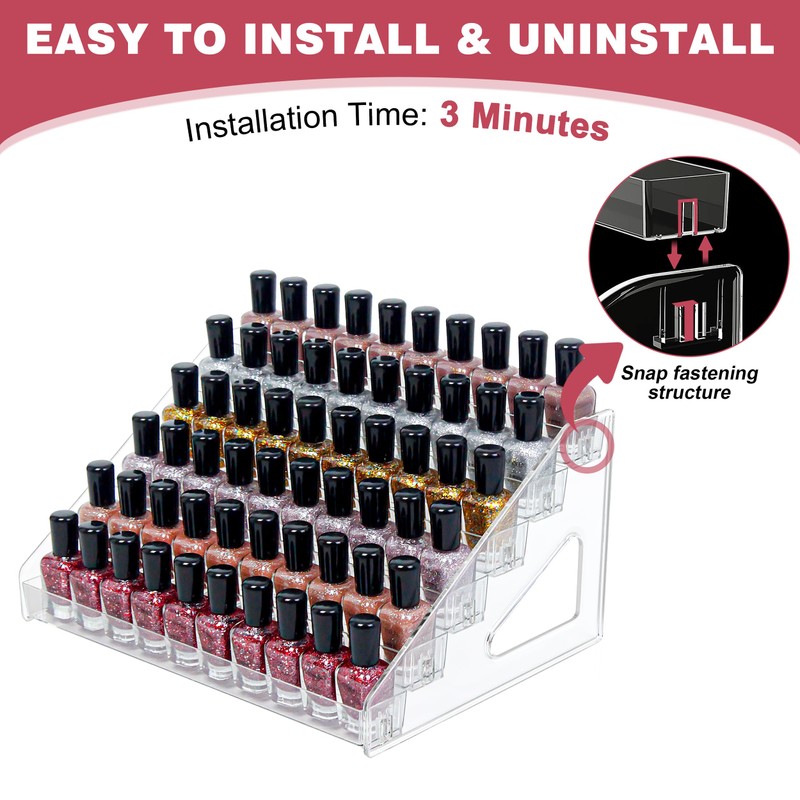 - LARGE CAPACITY, VERSATILE VERSATILITY: Holds 40-80 bottles of nail polish, sunglasses, lipsticks or essential oils. Open mouth design ensures quick access and visibility