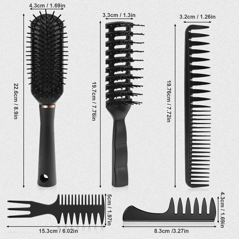 - 5-piece styling comb: 5 different shapes with different widths and densities meet all your hair styling requirements, such as pompadour, plane hairstyle, classic gentle oil head and etc. Hair brush set contains curl brush, ventilated hair brush sleek look for smooth blowouts, carbon hair cutting comb, hair comb coarse for detangling, 3-in-1 side parting comb. for precision parting.KComb for curls is also very suitable for girls to comb their curls and does not deform.