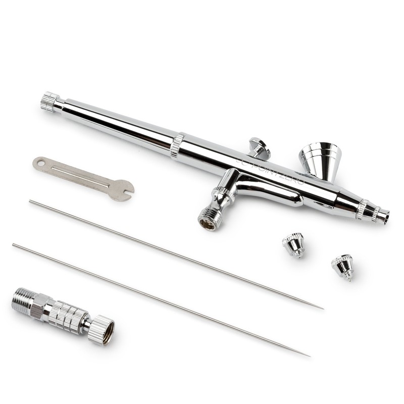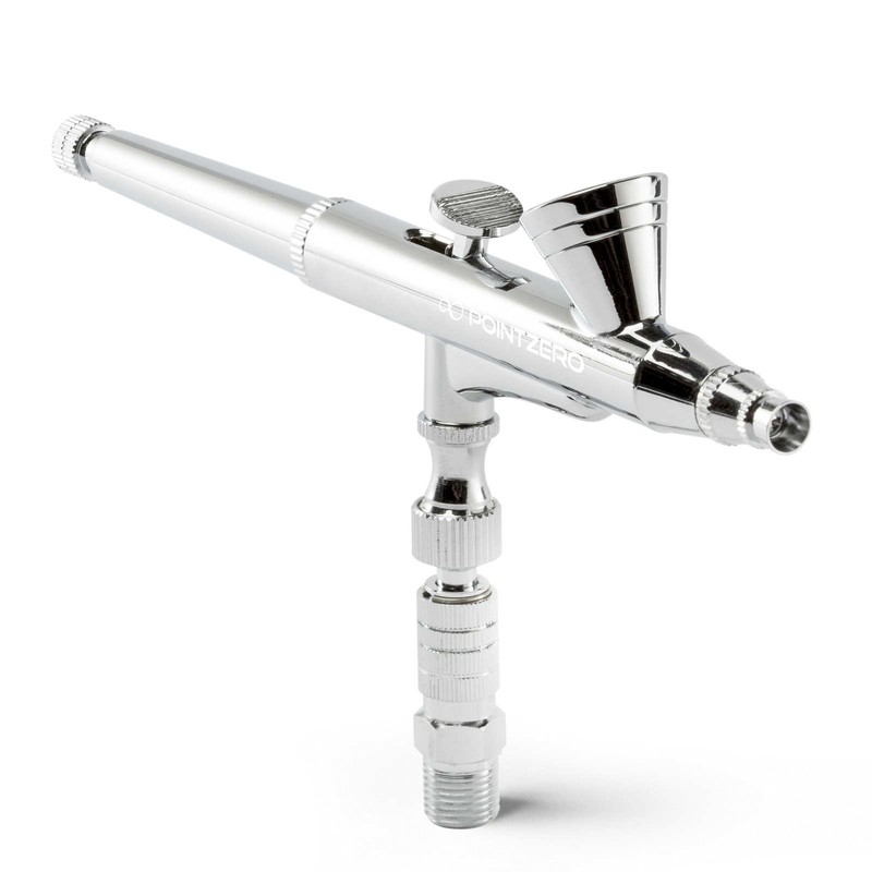 The PZ-270XS, from PointZero Airbrush, is a premium, dual-action (trigger independently controls release of both air and fluid; pressing trigger releases air, pulling back releases material), internal-mix airbrush. Precision-crafted body provides a balanced feel in the hand. Tight-tolerance head provides extremely fine atomization with razor-sharp detail. Needle backstop at the rear of the airbrush allows you to pre-set the trigger travel; helping produce consistent line widths. Fine-finish, stainless-steel needle minimizes tip-dry. Solvent-resistant needle packing allows safe use with all types of spraying mediums. Gravity-feed 2cc color cup; won't obstruct your view during fine detail work. Boxed set includes three sets of interchangeable nozzles (tips), nozzle caps and needles (0.2mm, 0.3mm and 0.5mm) for spray patterns varying from hairline to 1.75", a removable needle cap, quick-disconnect fitting, nozzle wrench and instruction sheet (needle cap and 0.2mm tip are pre-installed on airbrush). Requires an air supply with a working pressure of 15 to 50 psi. Standard 1/8" BSP fitting. As an added bonus, access to the following exclusive airbrushing guide downloads is included: Top 8 Cake Airbrushing Tips, Guide to Airbrush Cake Decorating, Developing Basic Artistic Skills, 10 Essential Airbrushing Tips, Airbrushing Strokes and Techniques, Airbrush Cleaning Manual, and the Airbrush Lettering Guide.