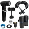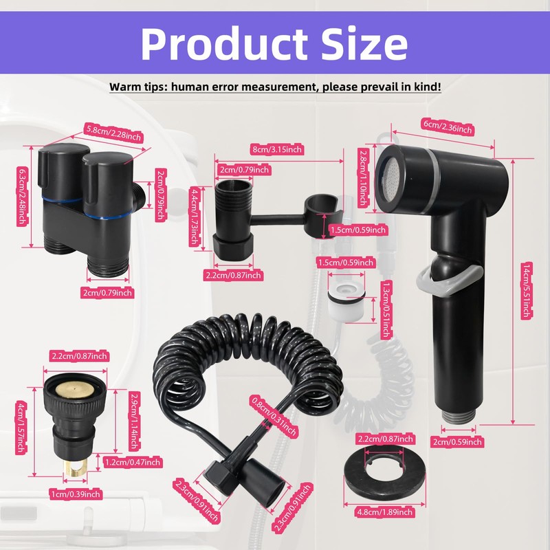 • Premium Matte Black Design & Complete Kit: Includes 1* matte black handheld bidet sprayer, 1* brass 1-in-2-out angle valve, 1* brass swivel bracket, and 78 reinforced spring hose + 4 black washing machine shut-off valve + sealing tape for leak-proof durability