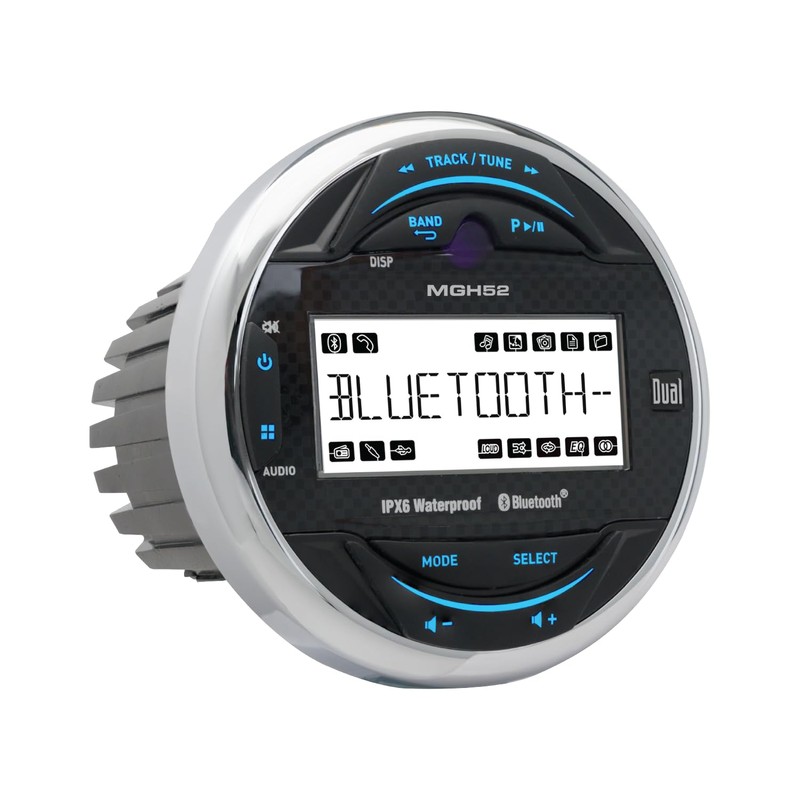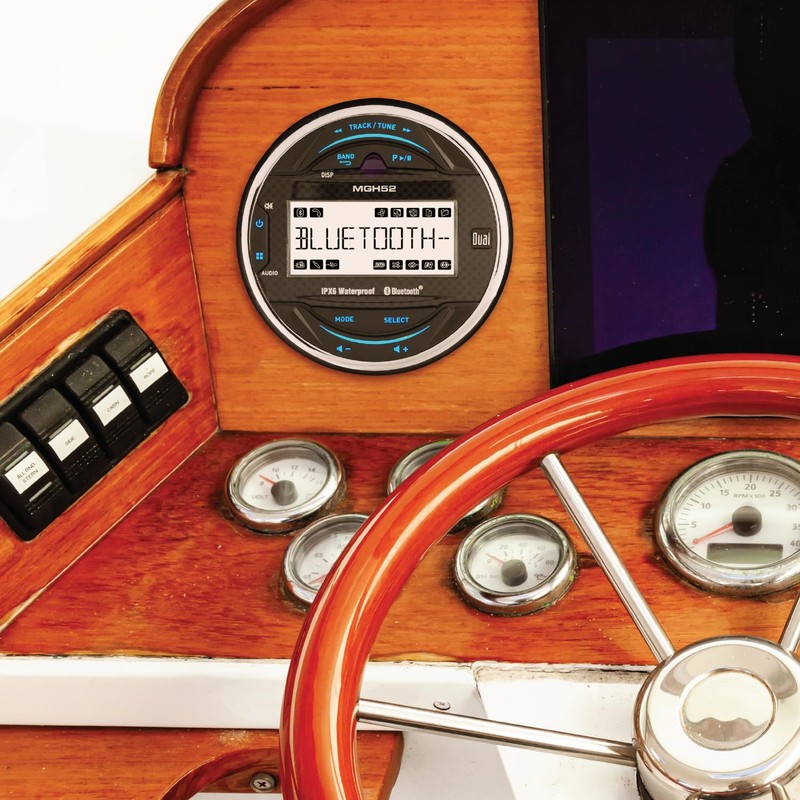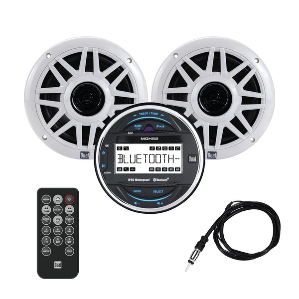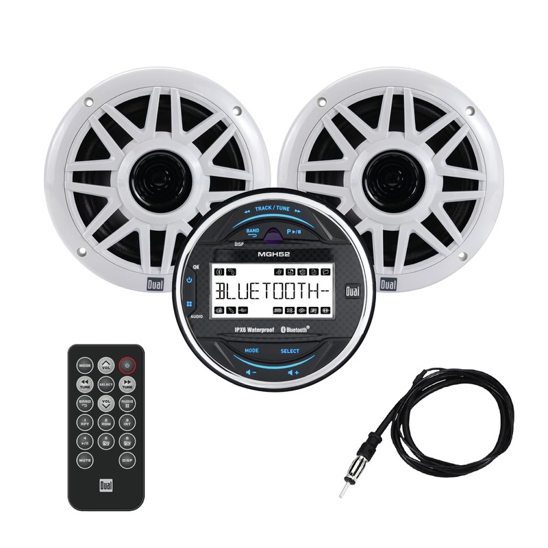 Better sound and Bluetooth for your boat Upgrading your boat's sound system is a great way to make every day on the water a little bit better. With this marine audio combo from Dual, you can upgrade your sound and improve your functionality without emptying your wallet. This package includes a marine-rated AM/FM Digital Media Receiver with built-in Bluetooth connectivity, a set of weather-resistant 6-1/2" marine speakers, and antenna. You'll get great sound, marine-rated reliability, and plenty of cool features. Plenty of ways to play music With the Dual MXPGH52 gaugehole receiver, you'll have more ways to enjoy your music collection on your boat. You can enjoy music stored on a USB drive, or plug an audio device into the rea AUX input. And built-in Bluetooth connectivity lets you stream music or make and take calls! The package includes a universal mount antenna, which you can install out of sight. If you want to connect an external amp, you'll find a set of RCA outputs. Made for marine use Dual designed this receiver to handle the extremes of life on the water, with a UV-resistant exterior that resists fading and a conformal-coated PC board that resists corrosion. All the openings are protected from salt and spray when not in use. The receiver features an 10-character black-on-white display that's easy to read day or night.