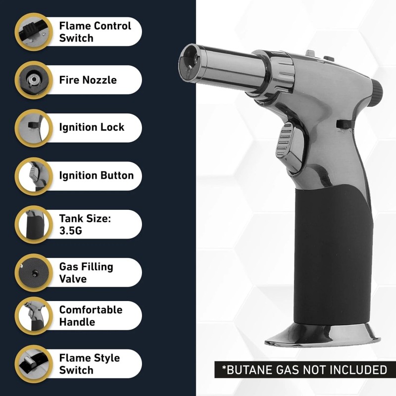 Dual Flame Butane Torch Gun - Refillable Luxury Hand Held Mini Blow Torch for Cooking, Creme Brulee, Soldering, Welding, & Resin Art - Adjustable Flame with Ignition Lock - Steel Black by