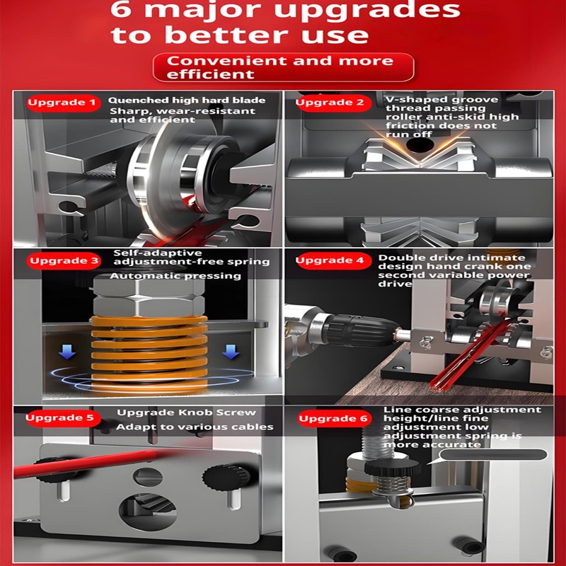 - Adjustable Wire Compatibility: Equipped with multiple feeding holes, this machine accommodates wires ranging from 0.04"-1" (1-25mm) in diameter. The adjustable blade height allows for precise stripping of various wire sizes, including flat and round cables.Our wire stripping tool features a patented self-adjusting crimping mechanism - simply set the cutting wheel height , the pressure plate automatically adapts for perfect crimp plate. The integrated spring-loaded blade system eliminates manual screw adjustments, with adaptive tension springs maintaining optimal cutting pressure throughout operation