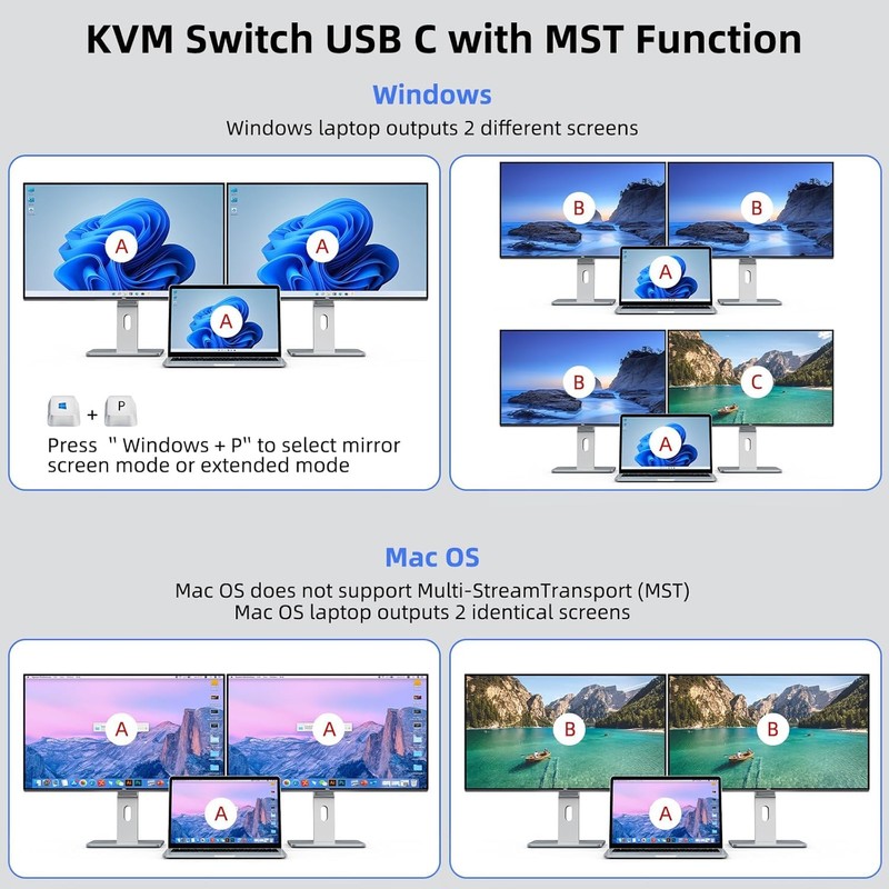 - 【Two Display Modes】𝐍𝐨𝐭𝐞: Only support mirrored output on macOS. USB-C KVM Switch 2 Monitors supports extension mode and copy mode for Windows laptops and desktops. The extended mode can output two different screens and the mirror mode can output two identical screens.