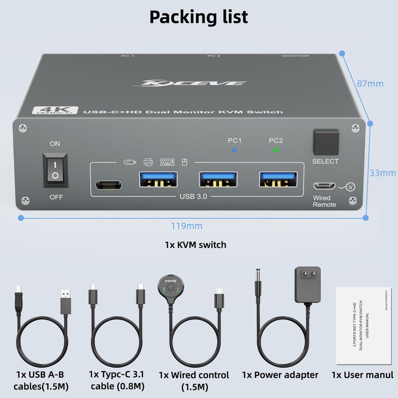 - 【Packing List】 USB C HDMI KVM Switch, 1 USB C cable for audio and video signal transmission, 1 USB3.0 A-B cable, 1 DC12V power adapter, 1 wired controller, instruction manual