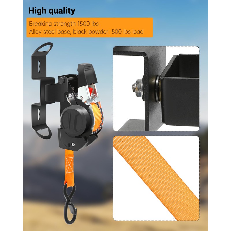 - High-quality materials : The base and ratchet are made of high-strength steel, coated with black anti-rust powder coating, the structure is sturdy and suitable for long-term outdoor use, the ratchet strap is made of high-quality polyester, Breaking tensile force of 1500 pounds,, tough and will not break easily