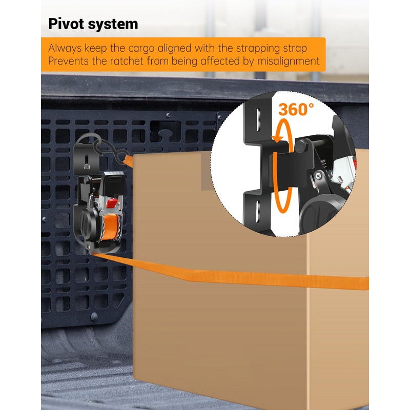 - Multi-angle rotation: Bed mounted ratchet straps adopts a double pivot design, which can rotate 360° and flip 180°. No matter which direction the pulling point is located, it can always keep the goods aligned with the strapping, avoiding the problem of the ratchet failing to retract and loose binding due to inappropriate angles