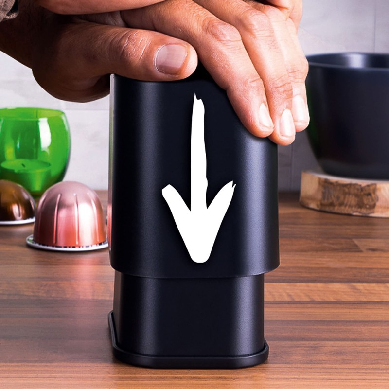- COMPACT DESIGN: EcoPress Compatible with Vertuo* is small in size and won't take up space in your kitchen. While you are EcoPressing, used coffee grounds are collected safely in the bucket ready to add to a compost heap or to food waste. *Vertuo is a brand owned by Société des Produits Nestlé S.A.