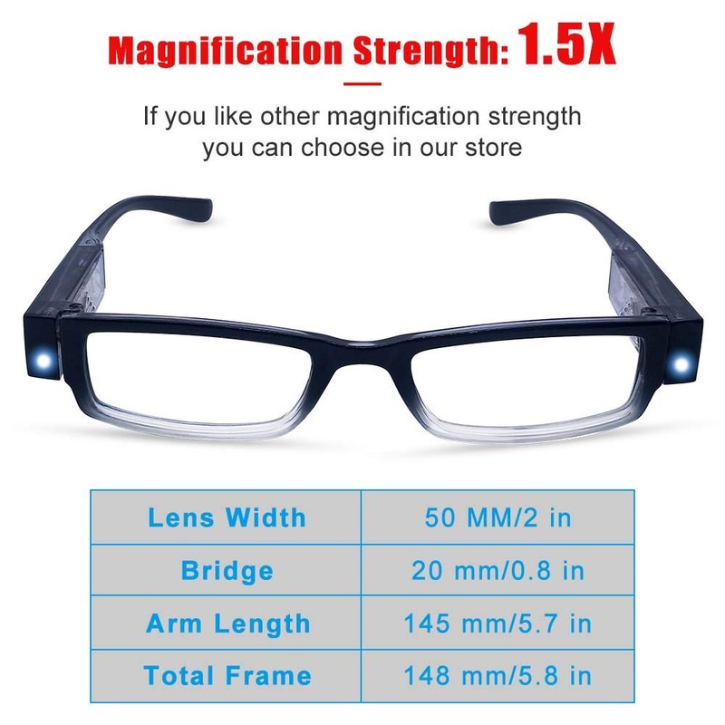 - Lighted Reading Glasses:Ultra-light and flexible resin frame material for durability and comfortable long-term wearing. Casual frame design keeps you looking professional and stylish while reading. Lens Width:50 mm/2 in | Bridge: 20 mm/0.8 in | Arm Length: 145 mm/5.7 in | Total Frame: 148 mm/5.8 in; There are seven reading glasses with different power of lens for you to choose from .