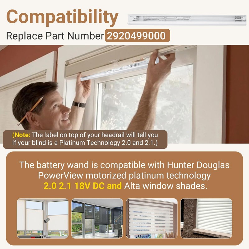 - 【Compatibility】Replaces part number 2920499000. The battery wand is compatible with Hunter Douglas PowerView Generation 2.0, 2.1 and Generation 3 motorized shades and blinds, also applicable to rolling shades, sheer shades, solar shades, outdoor shades.