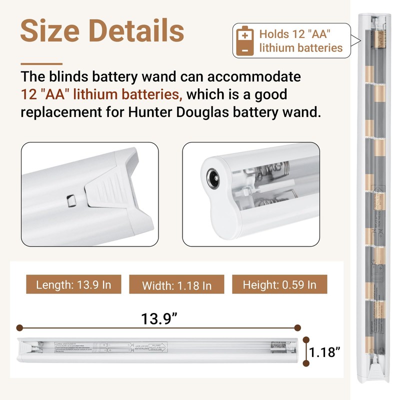 - 【Product Size】This blinds battery pack measures length 13.9 in, width 1.18 in and height 0.59 in, it is designed to hold 12 "AA" lithium batteries(not included) for optimum performance and is a good replacement for Hunter Douglas battery wand.