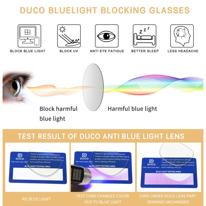 - 👍【Augen Schützen】Wenn Ihre Augen unangenehm sind, weil Sie lange vor dem Bildschirm sitzen, kann diese Anti-Blaulicht-Brille Ihnen helfen, den Druck auf Ihre Augen zu reduzieren. DUCO anti blue light glasses verfügen über eine spezielle Anti-Blaulicht-Beschichtung, die Kopfschmerzen, trockene Augen, schlechten Schlaf und andere Probleme, die durch den langfristigen Empfang von schädlichem blauem Licht verursacht werden, wirksam reduzieren kann.