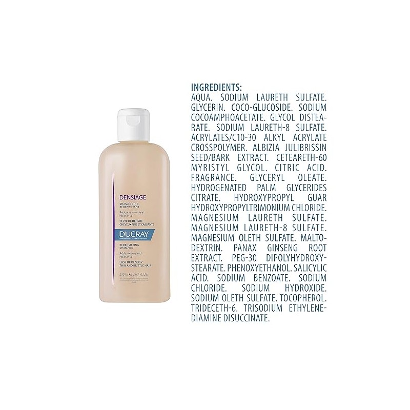 Ducray Densiage Redensifying Shampoo: Revitalize Thinning Hair for Fuller, Stronger Locks. Combat the signs of aging hair with Ducray Densiage Redensifying Shampoo. This creamy, protective formula gently cleanses, restores volume, and strengthens fine, brittle hair. Enriched with Albizia and Ginseng, this shampoo revitalizes your hair's vitality and density, leaving it looking and feeling youthful.