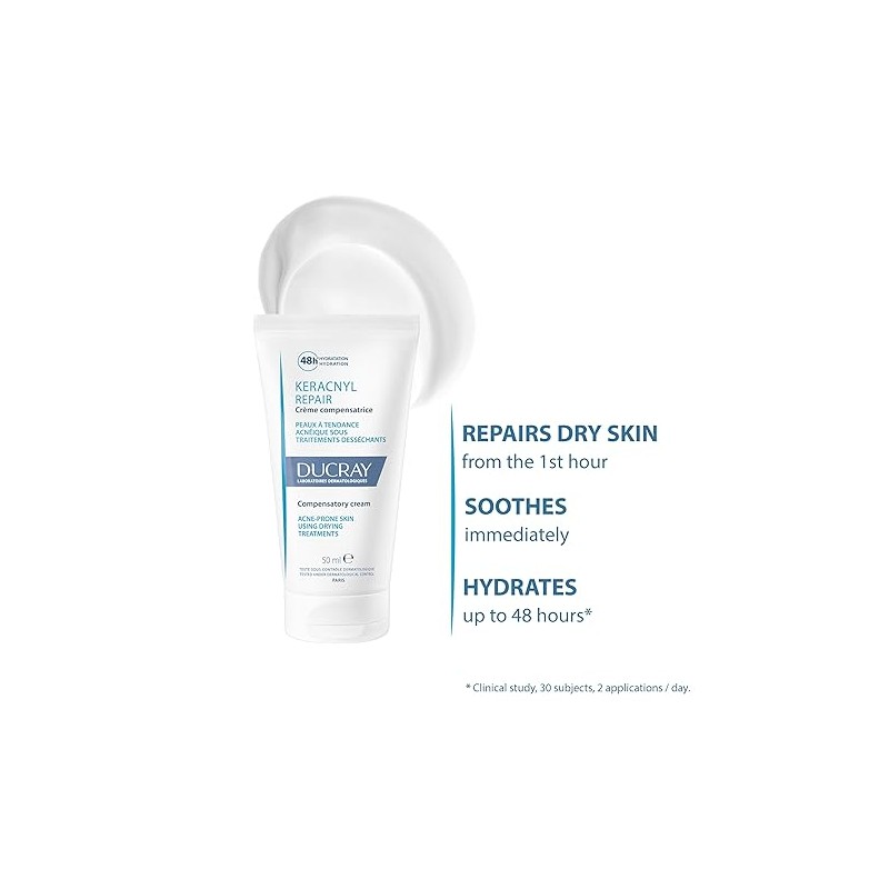 Combat dryness and irritation from acne treatments with Ducray Keracnyl Repair Cream. This 50mL tube delivers immediate soothing and 48-hour hydration, restoring skin weakened by drying acne medications. Formulated with Hydra-compensatory technology and Niacinamide, it strengthens the skin barrier, reduces redness, and prevents dryness. Experience instant comfort and long-lasting moisture with this non-greasy, non-comedogenic cream.