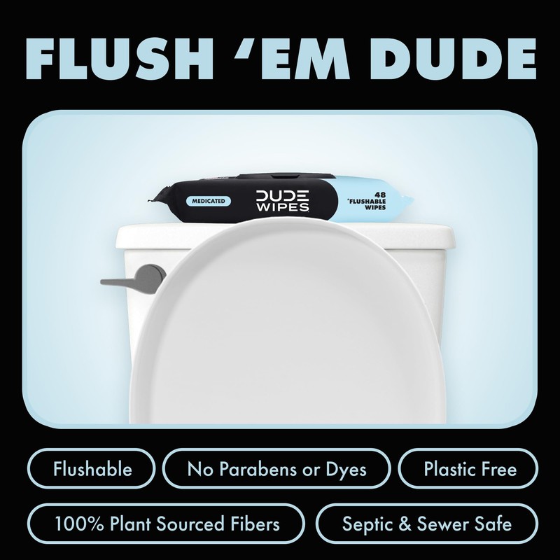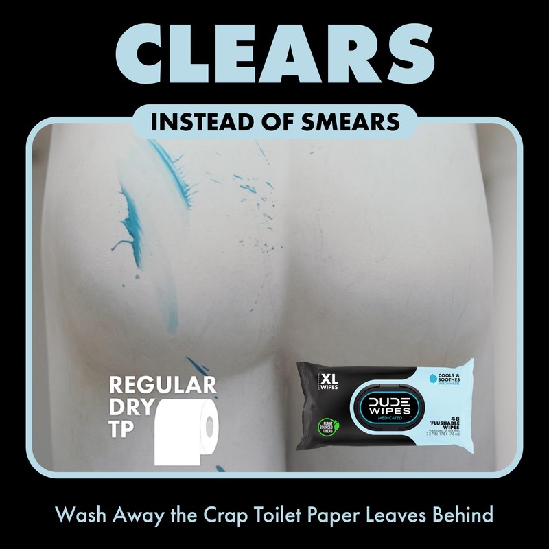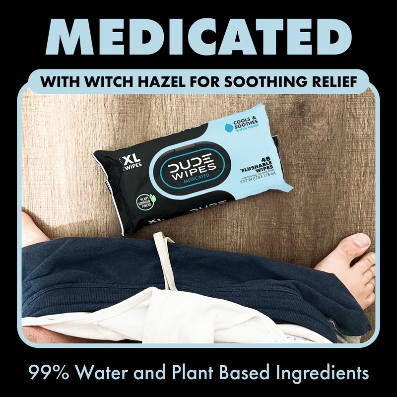 DUDE Medicated Wipes are made with 25% witch hazel to provide medicated relief that soothes irritation, hemorrhoids, and burning. Our formula is unscented with Aloe Vera and Vitamin E to be gentle on your skin and leave you feeling refreshed. Our easy dispensers serve you flushable wipes that are extra large hemorrhoid treatment wipes to tackle any job your butt or DUDE regions require.
