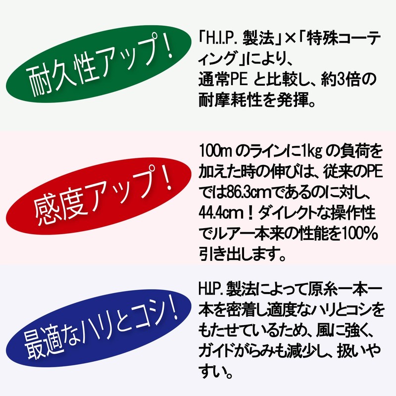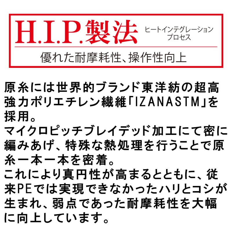 - [Moderate firmness and elasticity] By using H.I.P. manufacturing method, each strand has a moderate amount of stiffness, making it strong against wind and reducing guides and easy to handle. Dramatically reduces troubles during lure casting and operation. You can fish without stress
