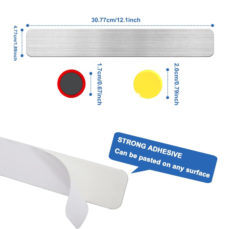 - 【MAGNETIC DISPLAY】Our magnetic board for wall for magnets themself are not magnetic and can only be used as magnetic display boards, you need magnetic objects to attract and fixed.This magnetic strip is perfect for displaying magnets, magnetic spice jars, magnetic alphabet animals, photo, card and more. These magnet strips with adhesive backing, size is 12.1" X 1.89";10pcs Colored Magnets, size is 0.79"X0.31". Magnet board for wall makes a great alternative to heavy and clunky cork board strips