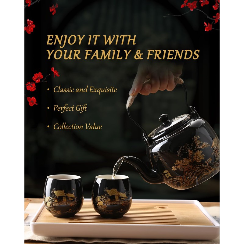 Dujust Japanese Tea Set, Black Porcelain Tea Set with 1 Teapot Set, 6 Tea Cups, 1 Tea Tray, 1 Stainless Infuser, Beautiful Asian Tea Sets for Adults, Tea Lover/Women/Men (Countryside in Golden)