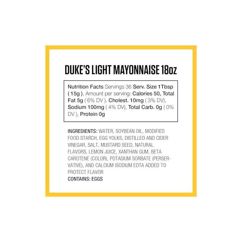 - Light Mayonnaise: Dukes Light Mayonnaise is half the fat and calories of regular mayonnaise. This mayonnaise continues a 100-year legacy, delivering the same rich, creamy texture and tangy taste that has made it a staple in kitchens across the South; made from fresh eggs and high-quality oil, a velvety texture that adds a savory touch to dishes without being heavy or greasy.