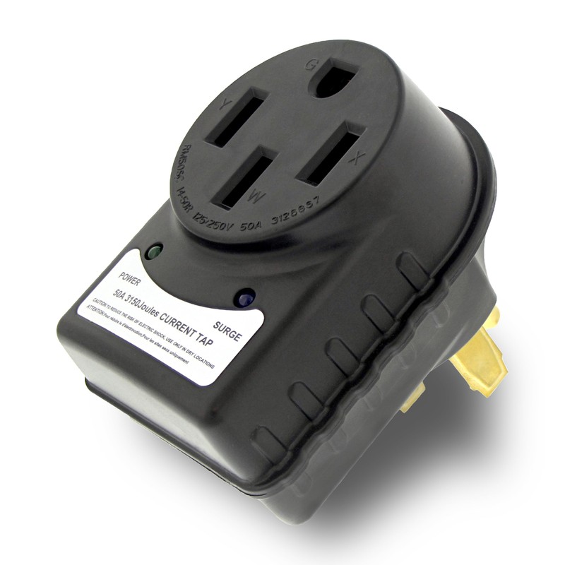 - [Easy To Use]: Plug the 50 amp male (NEMA 14-50P) end into the camper receptacle outlet; Green 'Power' light indicates electricity is running, while blue 'Surge' light signifies the connection is protected; 50a surge protectors do not check for correct wiring; RV circuit analyzer not included