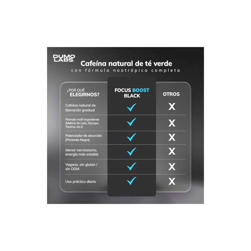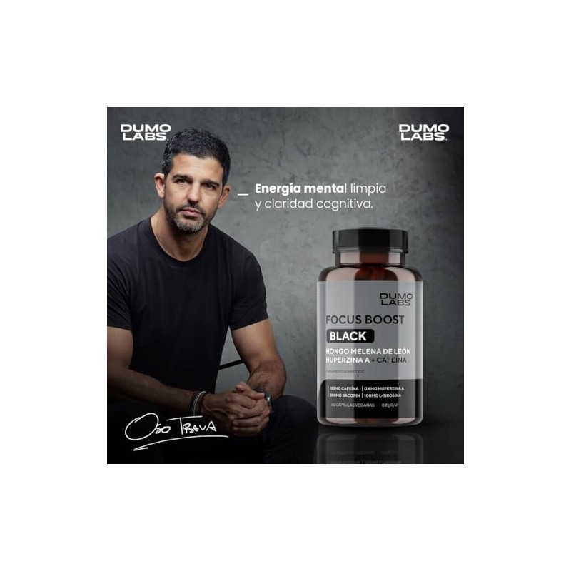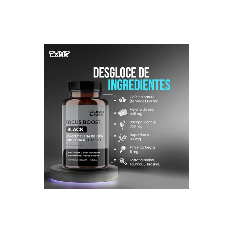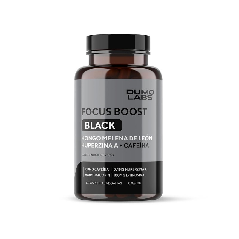 Dumo Focus Boost Black Nootrpico Natural con Melena de Len, Bacopa, Cafena y Huperzina A Energa Mental, Enfoque y Rendimiento Diario 60 Cpsulas...