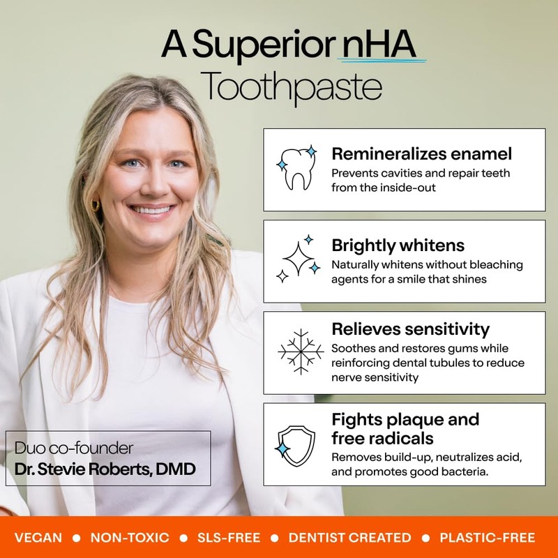 - NHA + MELATONIN & L-THEANINE - Discover a holistic approach to oral care and relaxation, combining premium toothpaste with natural calming aids that absorb as you brush. Our product is formulated with nano-sized hydroxyapatite particles that help to remineralize teeth, improve sensitivity, and naturally brighten your smile. The pairing of Melatonin (1.5mg) and L-Theanine (2.5mg) promotes regular circadian rhythms and deep relaxation.