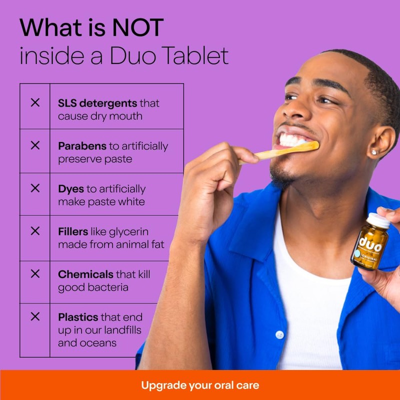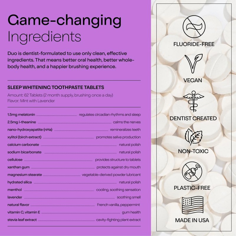 - WHITENING TOOTHPASTE FOR BEDTIME - Improve your dental health with our Duo Whitening Toothpaste before bedtime with luxurious Lavender Mint that soothes and calms to help you leave the day behind. This unique fusion of a whitening toothpaste tablet and calming ingredients is designed to brighten your smile while preparing you for a peaceful rest. Experience visible whitening, strengthening, and protection for your teeth.