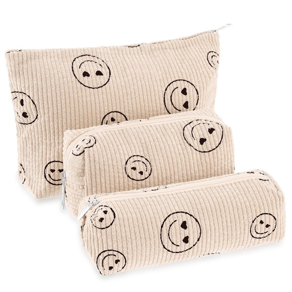 DUOMIAO 3 Pcs Makeup Bag Corduroy Cosmetic Bag Aesthetic Cute Preppy Makeup Bags for Women Smile Small Makeup Purse Pouch Travel Toiletry Bag Set Makeup Organizer with Zipper. (White smlie)