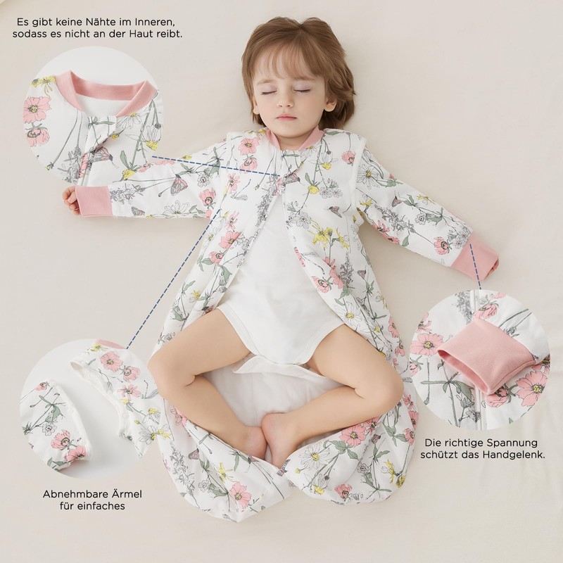 Duomiaomiao Baby Winter Sleeping Bag, 2.5 Tog Sleeping Bag 0-6 months 100% Cotton Baby Wearable Blanket with Removable Sleeves for Newborn, Flowers