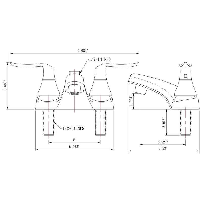 - Specifications | Works on any 2-hole sink opening. Depth is 5.6”, center to center installation width is 4”, and height is 3.5”. Male 1/2” -14NPS thread. Made from premium grade lightweight synthetic waterways. This faucet is ADA compliant, UPC and CUPC certified.