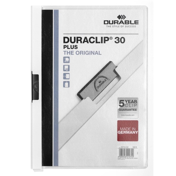 Durable original Duraclip file with a special sprung steel clip. Made of PVC plastic. Ideal for presentations, filing, quotations, conference/seminar notes and reports. Available in white colour. The Duraclip Plus folder has a capacity of 30 A4 sheets, a transparent pocket on the front cover and coloured back and spine. Cover imprints, such as company logos, transform Duraclip into a unique advertising facility. Measures 220 mm width by 310 mm height.