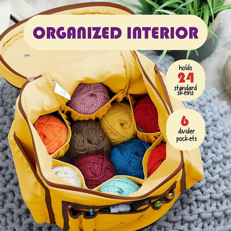 - EXTRA LARGE CAPACITY KNITTING BAG: Our yarn storage organizer holds 24 standard skeins and boasts 13 pockets, with 2 large side pockets, quick-access front supplies pocket, and 6 pockets inside the yarn bag, plus an extra supplies pouch that attaches to the bag.