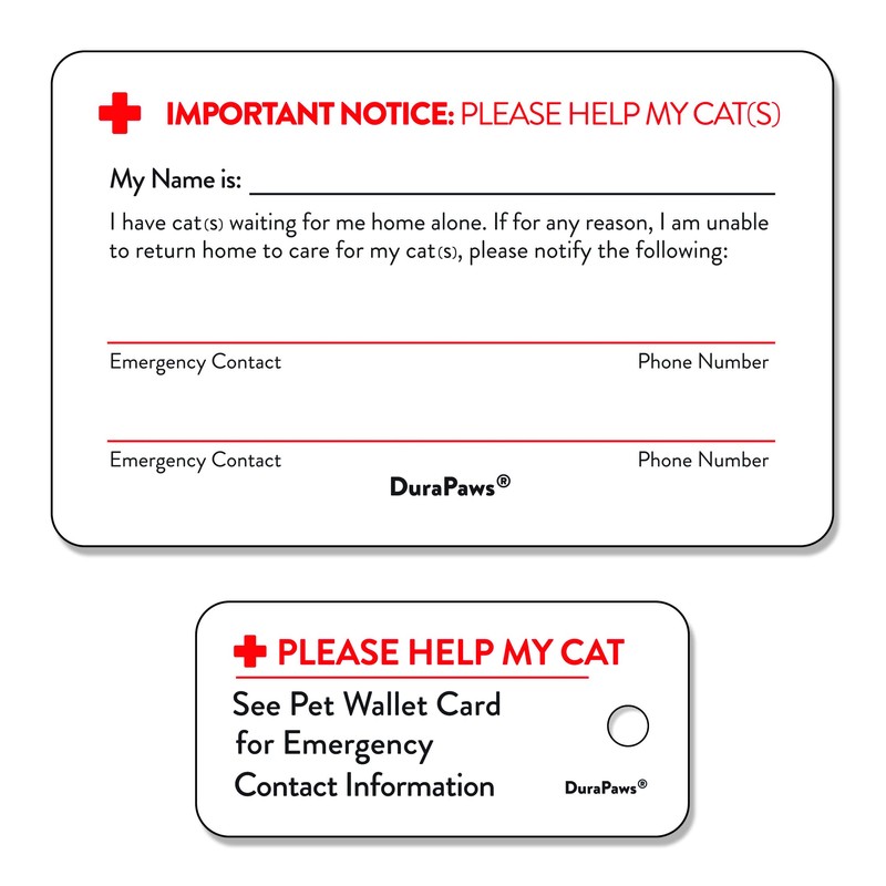 • SAFEGUARD YOUR CAT’S SAFETY & PROTECTION: If you’re in a position where you are injured outside of your home, our DuraPaws Cat Emergency Alert cards/key tags can alert responders to call your emergency contact(s) to let them know you’re hurt and your cat(s) are home alone.