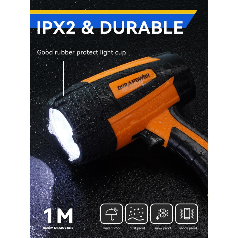 Durapower Rechargeable Spotlight, 500 Lumens LED Spotlight Flashlight, IPX2 Waterproof Handheld Spot Light for Indoor Outdoor Farm Camping Emergency (Orange)