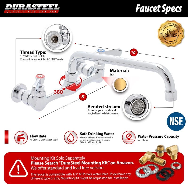 - NSF Certified: DuraSteel kitchen faucet is certified by NSF and made with low-lead material which is safer than other faucets. Equip yourself with the faucet installation kit for 1/2" NPT female inlets and set up the faucet. Fits DuraSteel stainless steel compartment and utility sinks that requires an 8" centered faucet.