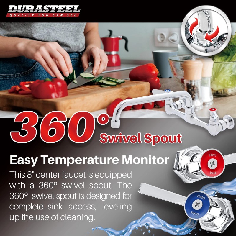 DuraSteel Commercial Kitchen Sink Faucet - No Lead 8" Center Wall Mount Utility Sink Faucet with 10'' Swivel Spout - NSF Certified - Dual Lever Handles - Brass Constructed & Chrome Polished